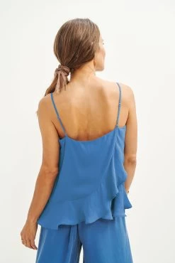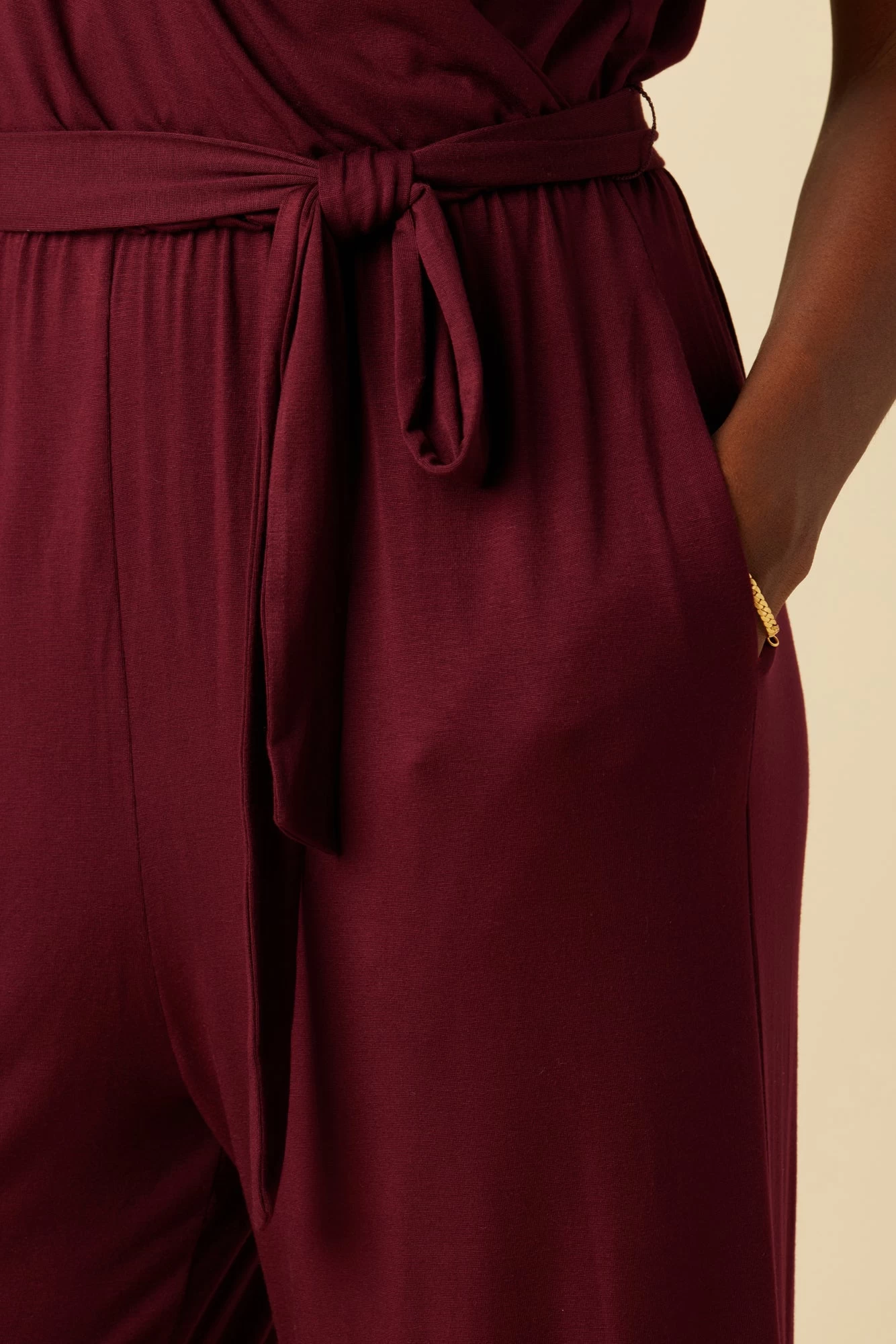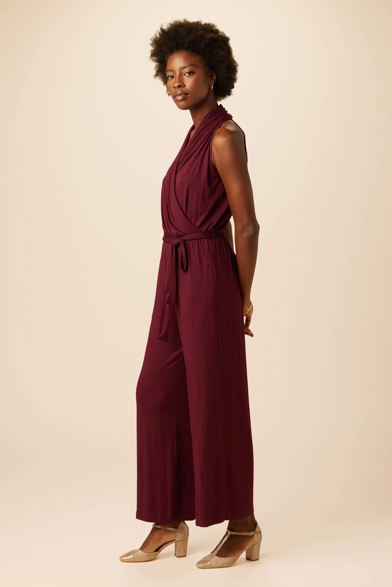 - This wide leg style features a wrap halter top, shirring at the sides, detachable waist tie, pockets and pulls on for ease.