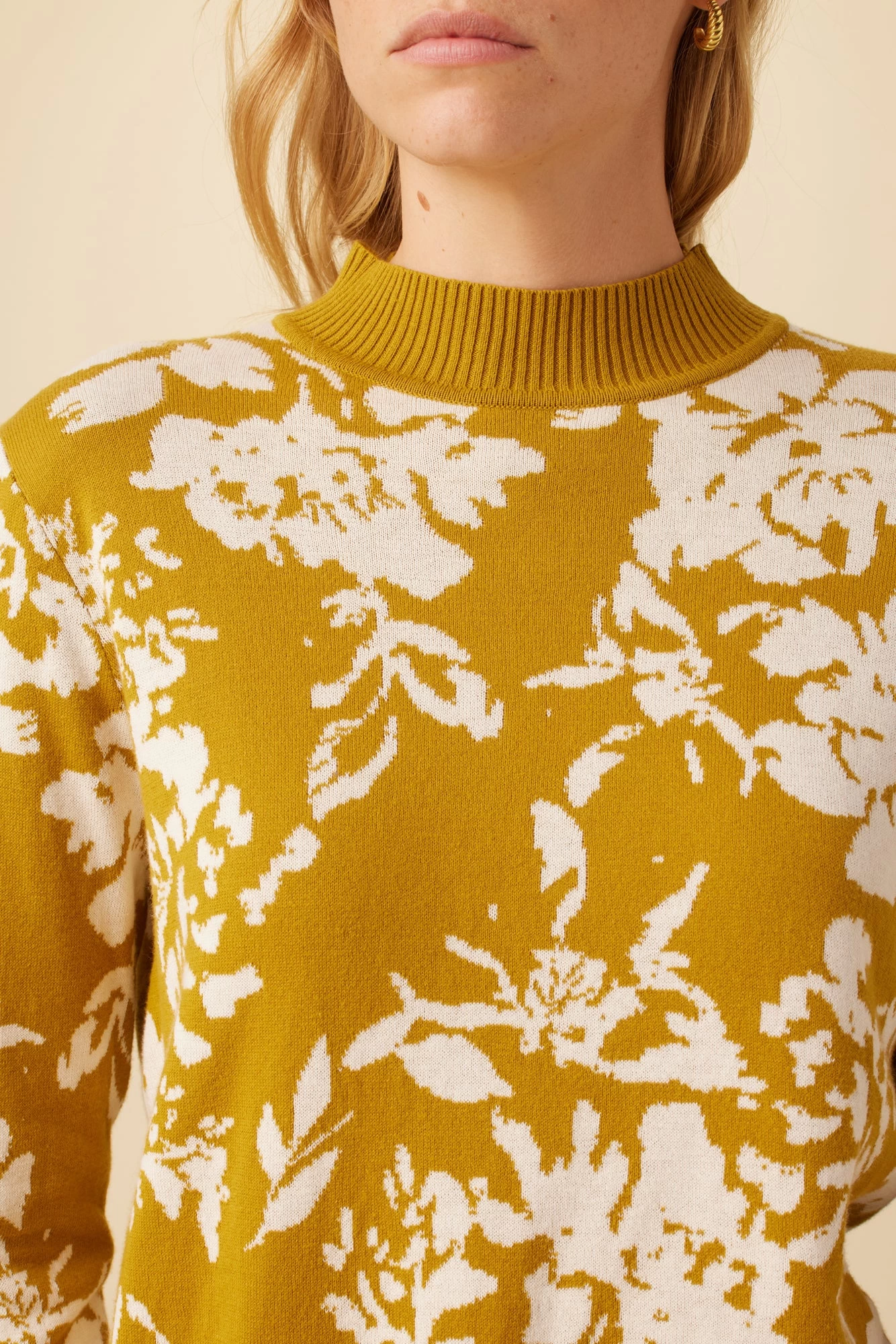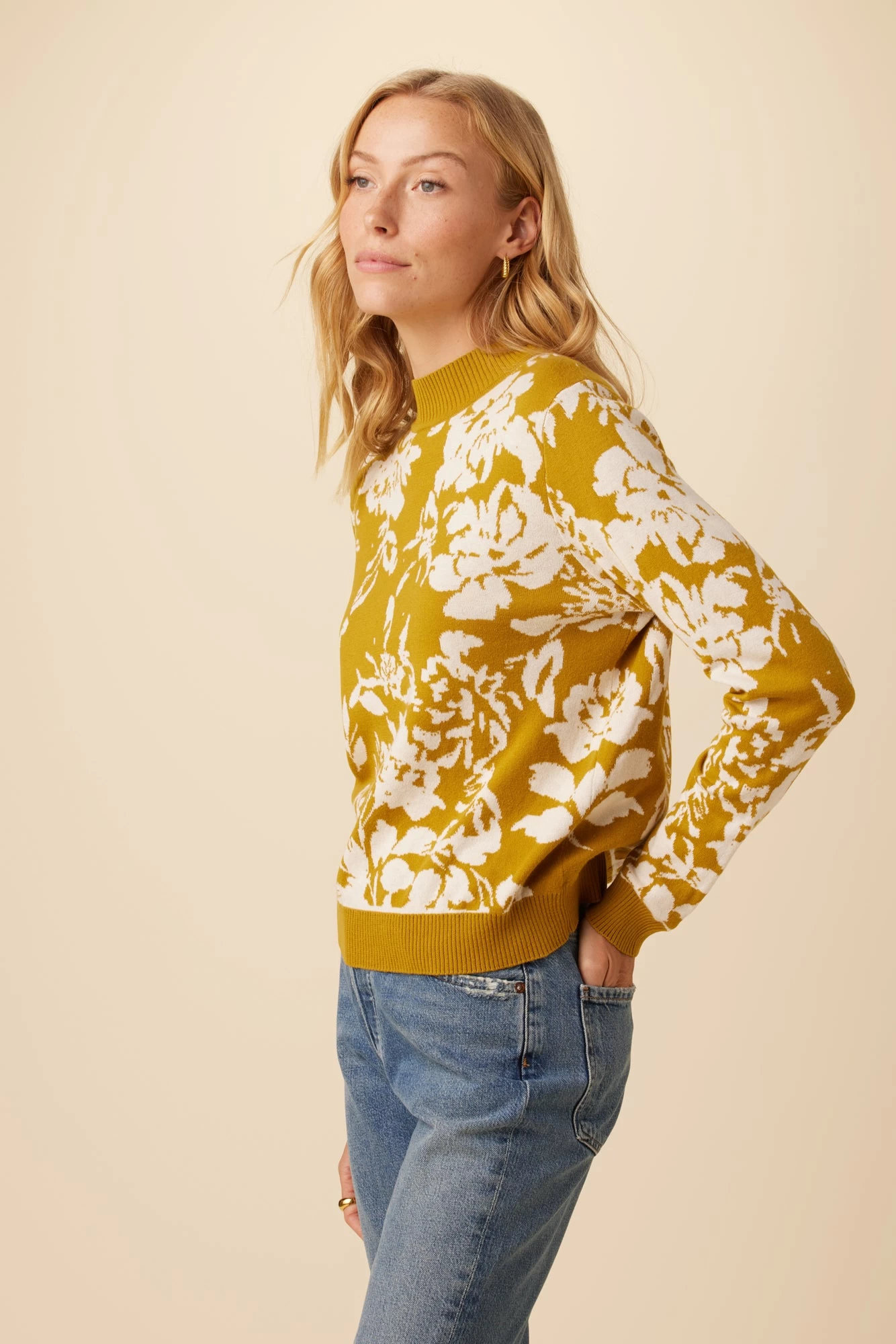 Fine gauge sweater with a ribbed mock neck and floral jacquard pattern, made from organic cotton. This lightweight and transitional sweater pairs well with denim or your favorite high-rise bottoms.