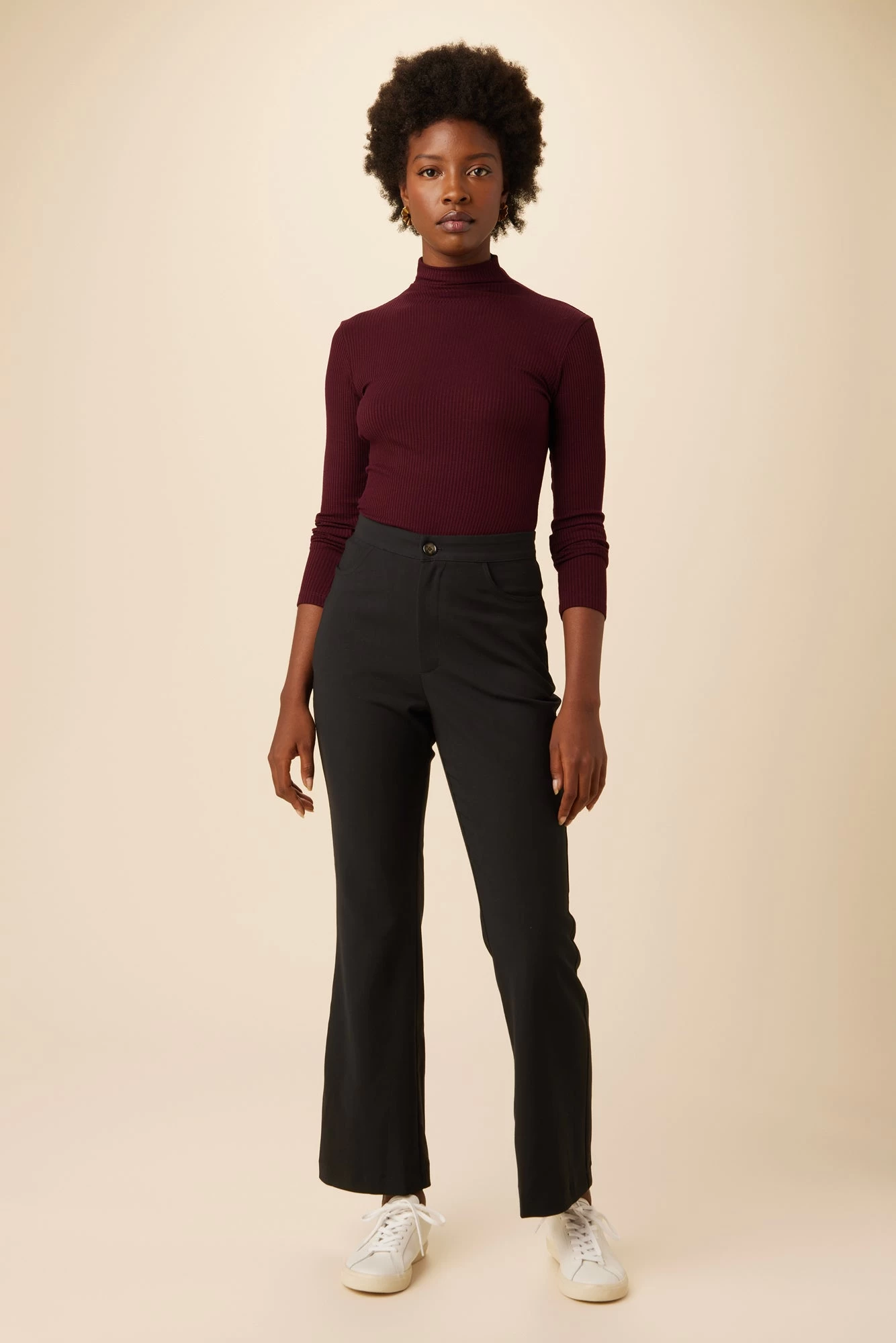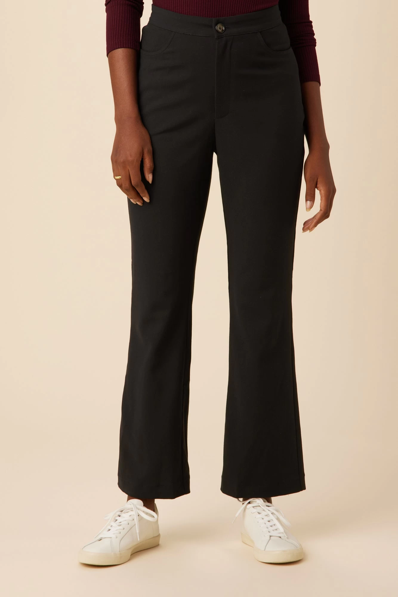 - Slim fit, full-length flare leg pant featuring button fly and pockets.