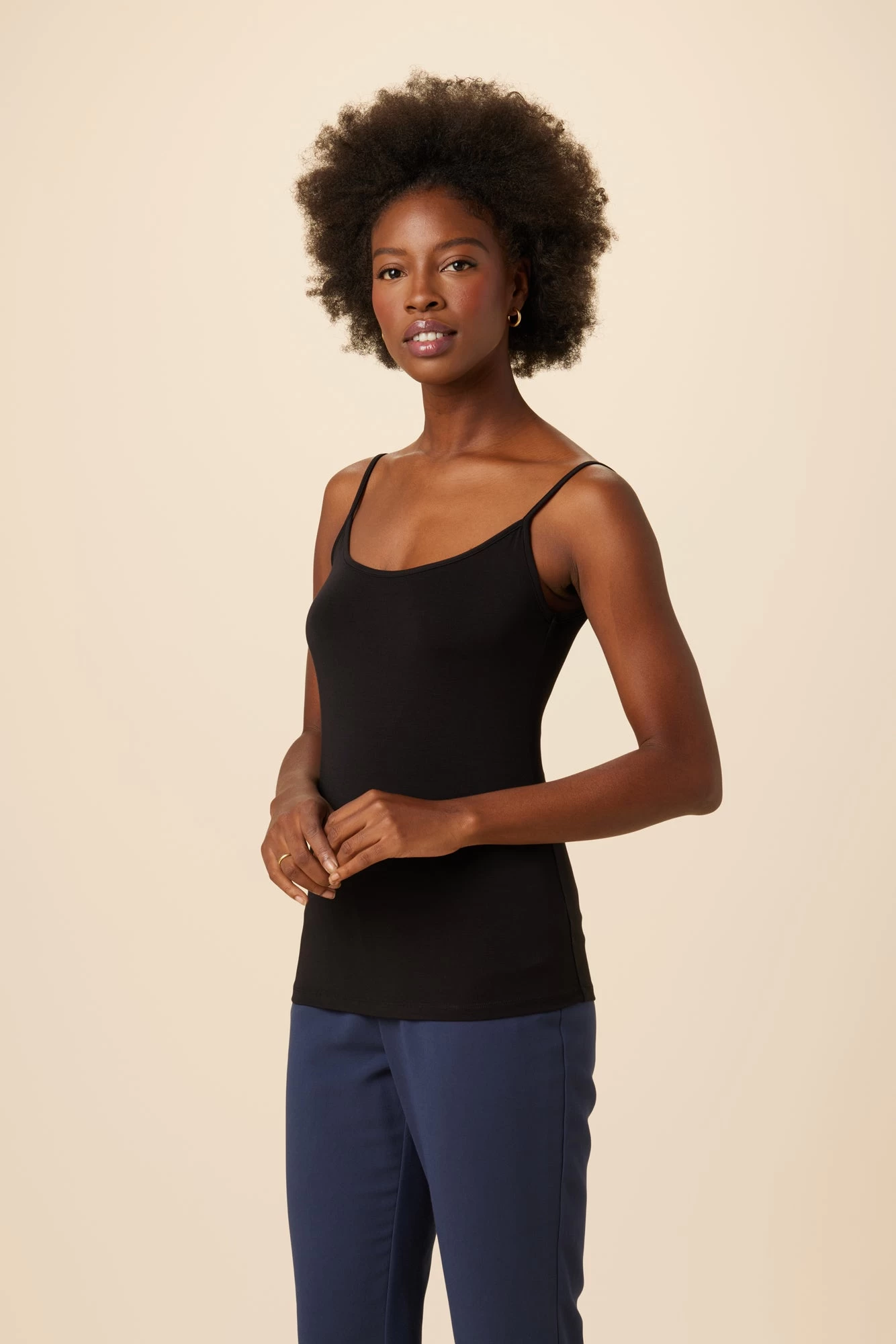 - Features thin spaghetti straps, a classic camisole fit