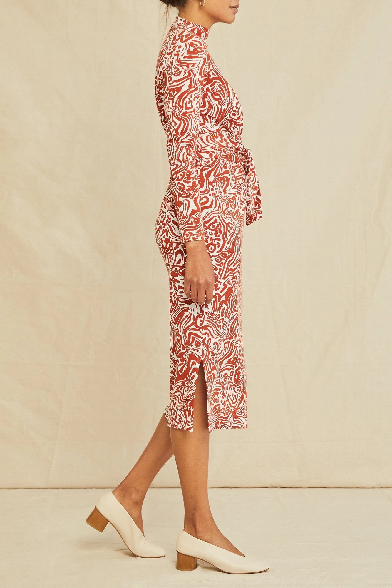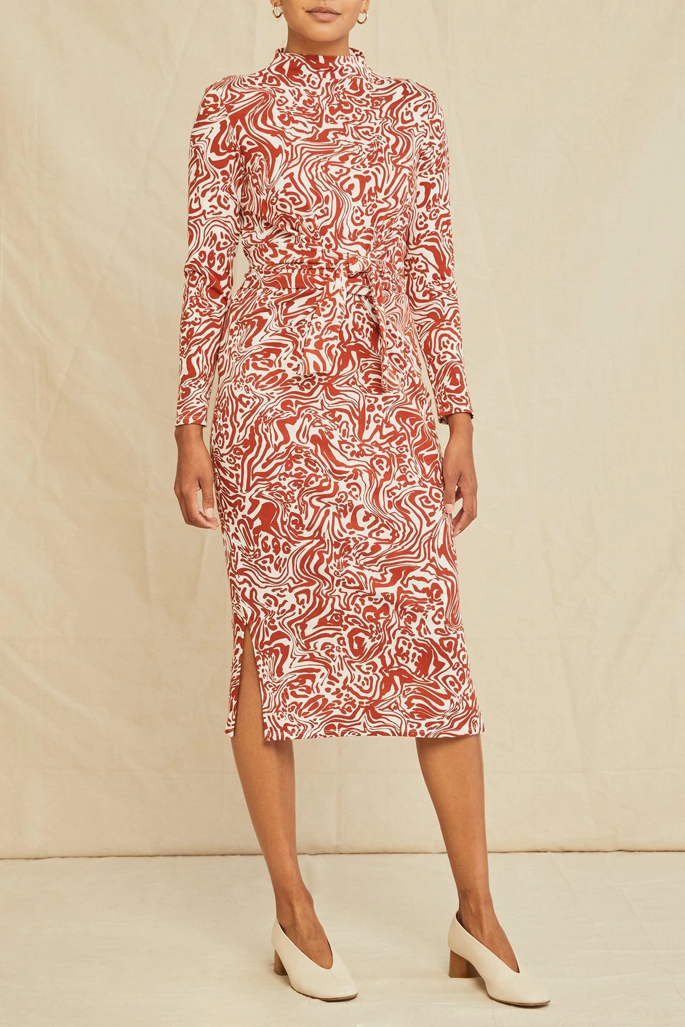 Midi dress featuring a mock neck, long sleeves, and an adjustable waist tie. Made from our premium blend of Organic Cotton and Modal for a soft and comfortable fit.