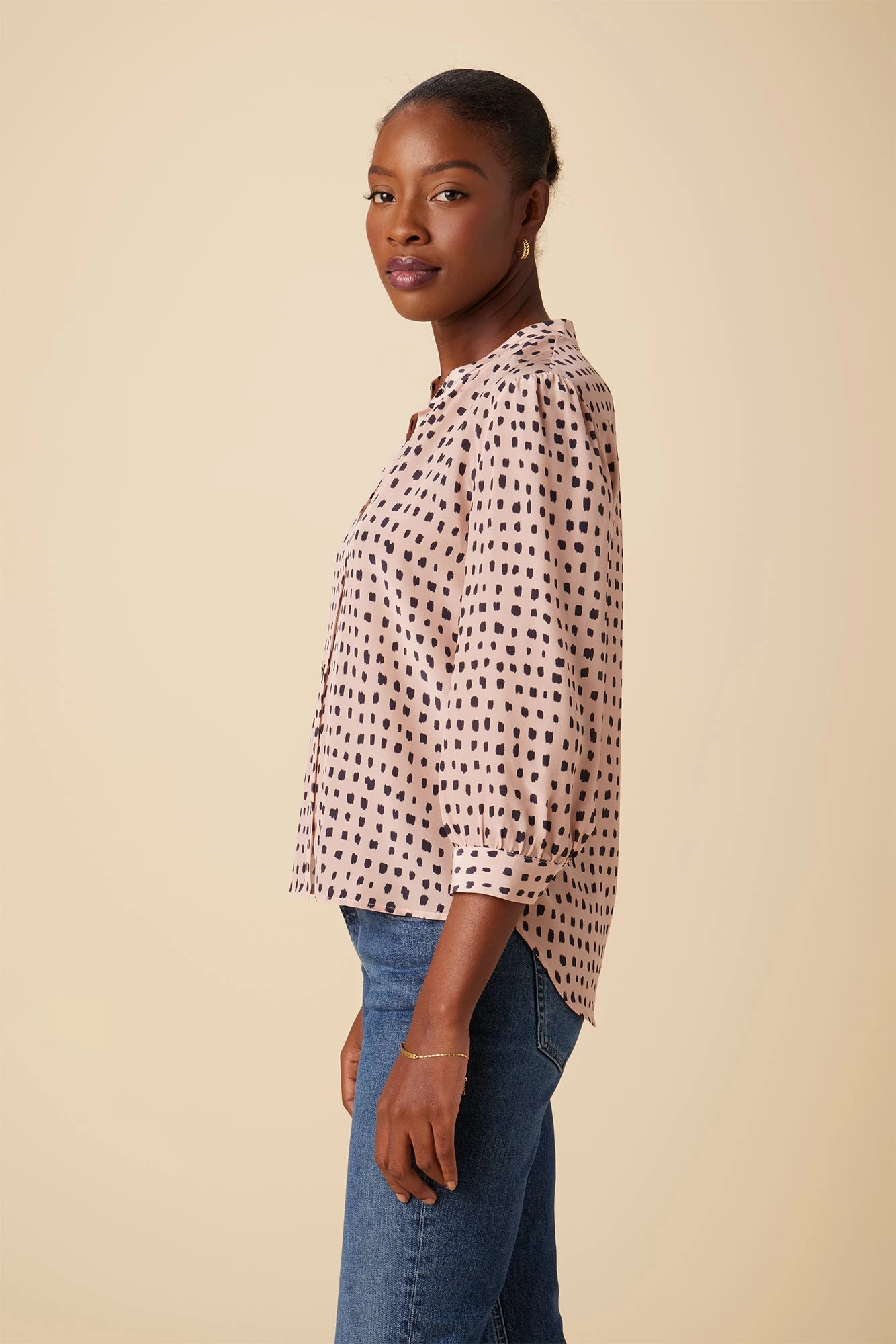 - 3/4 sleeve blouse featuring full button front placket, slight puff sleeves and sheering at the neckline.