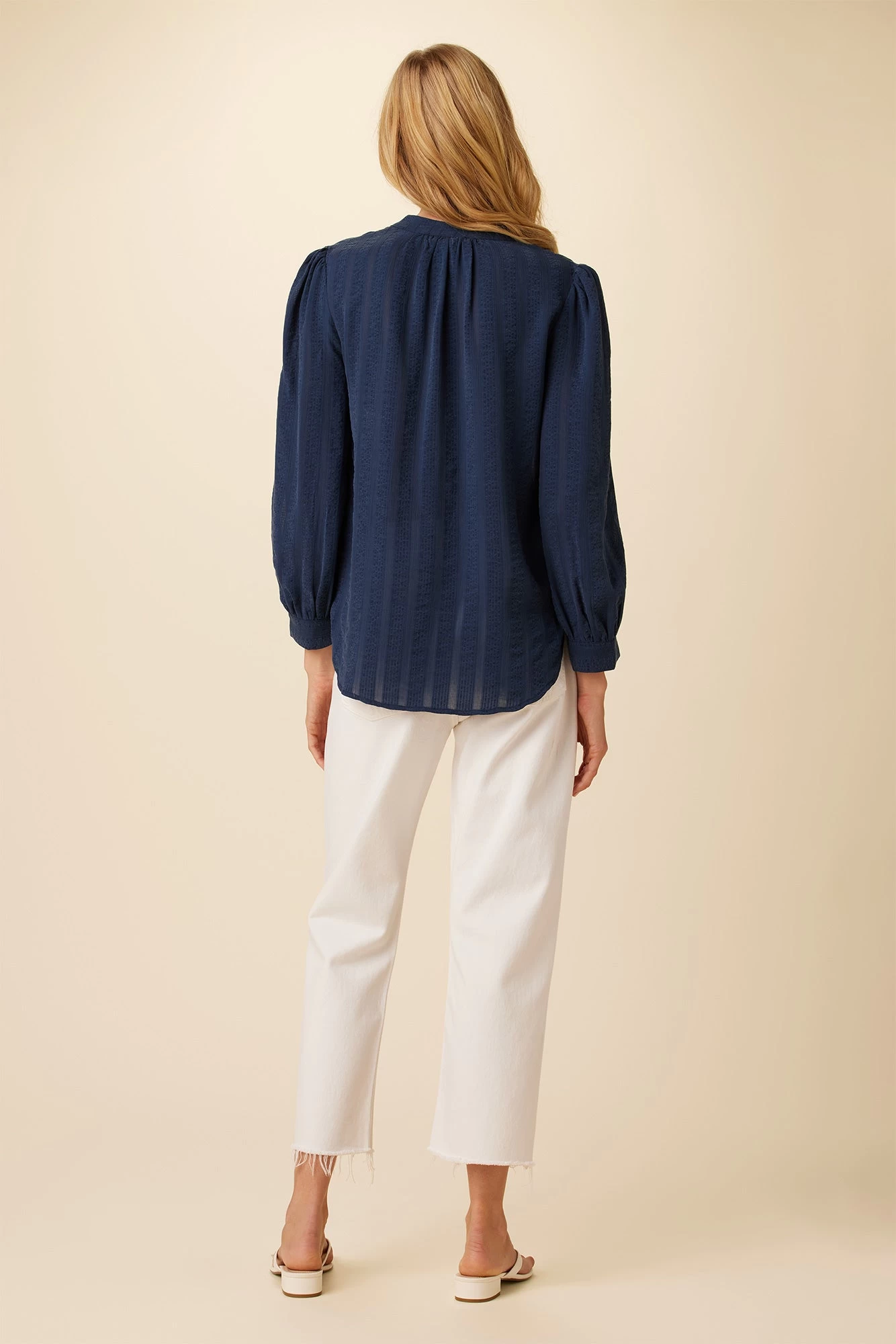 Long sleeve, relaxed fit blouse with functional front button, made from TENCELâ„¢, a fabric derived from eucalyptus trees that is softer than silk and cooler than linen. We suggest pairing with your favorite mid or high-rise bottoms.