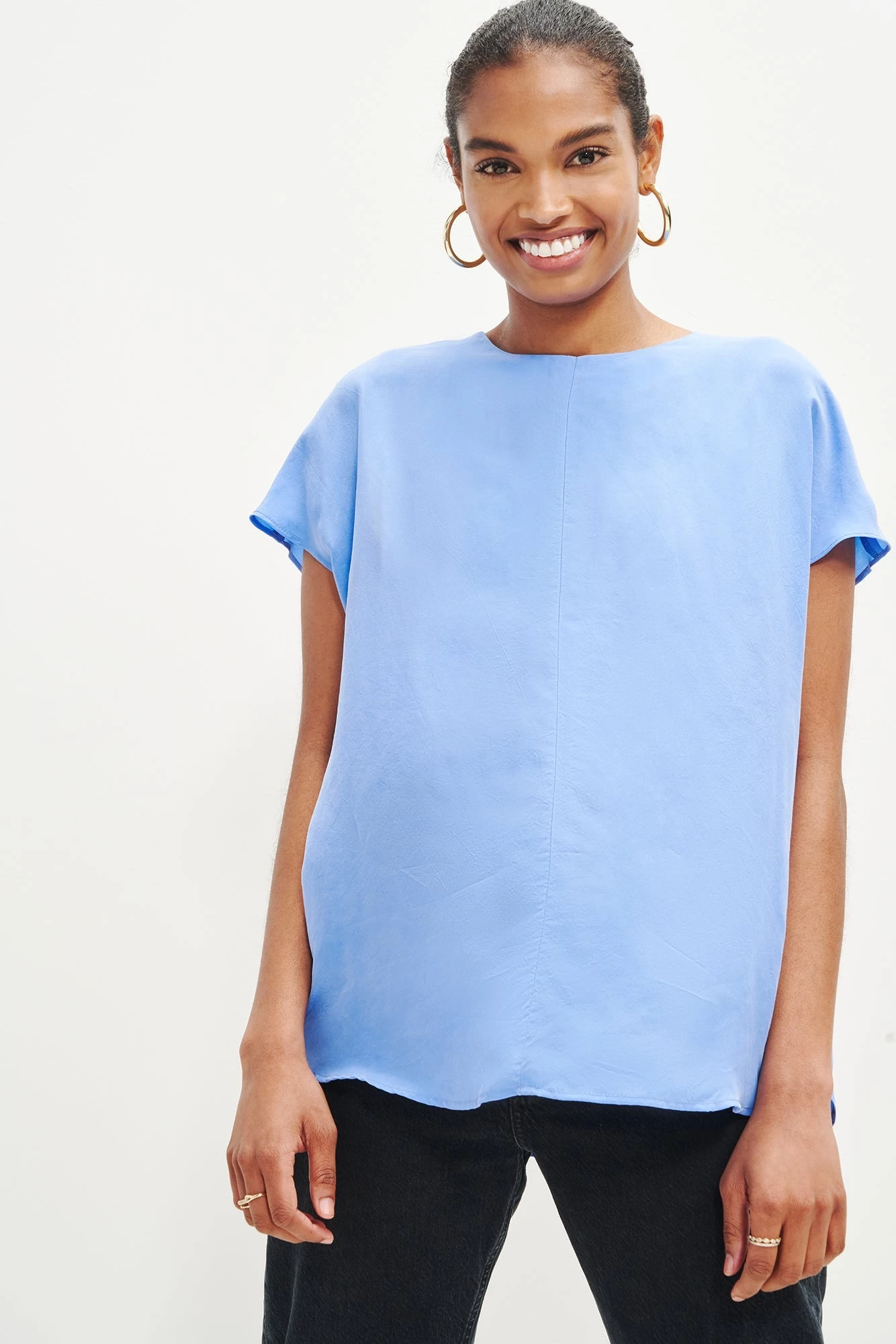 Short sleeve top with a long, relaxed silhouette and zipper closure at the back. Made in our Cottonseed Cupro, a plant-based fabric made entirely from discarded cotton waste.