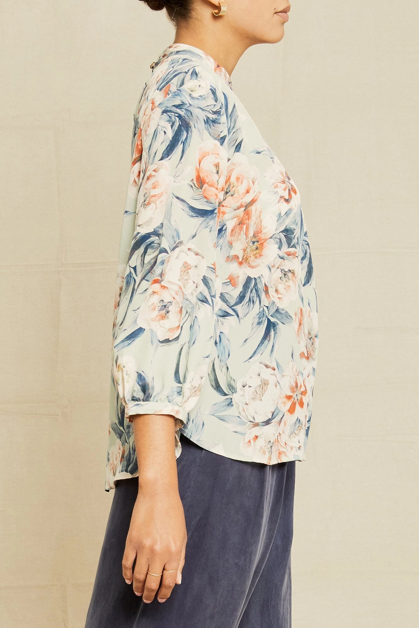 Mock neck blouse with gathering in front, 3/4 length voluminous sleeves with bracelet cuffs, and a keyhole opening in back.