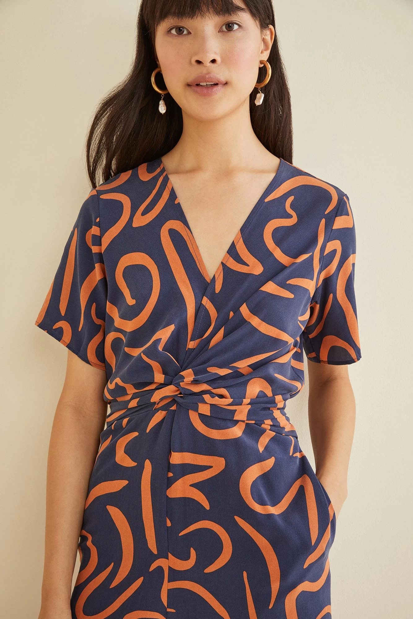 Short sleeve jumpsuit with a v-neckline, wide cropped leg, and fixed twist detail at the waist. Made in our finest, sustainably sourced Mulberry silk.