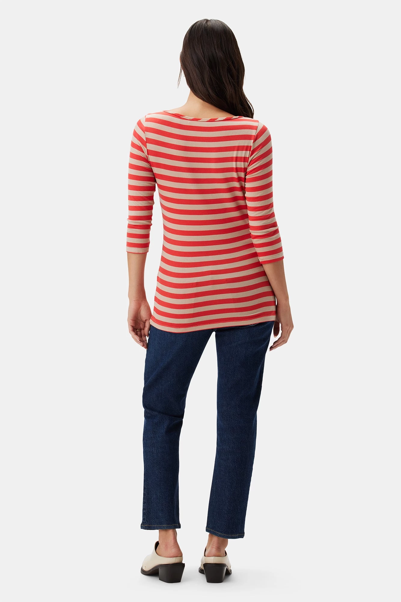 - 3/4 sleeve tee with a classic boat neckline and easy silhouette.