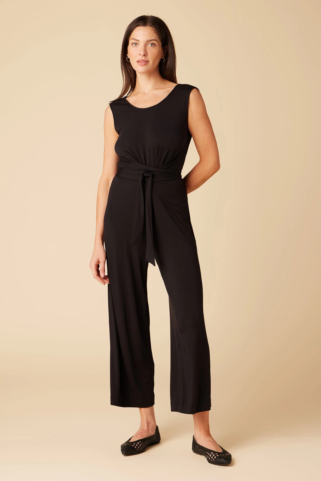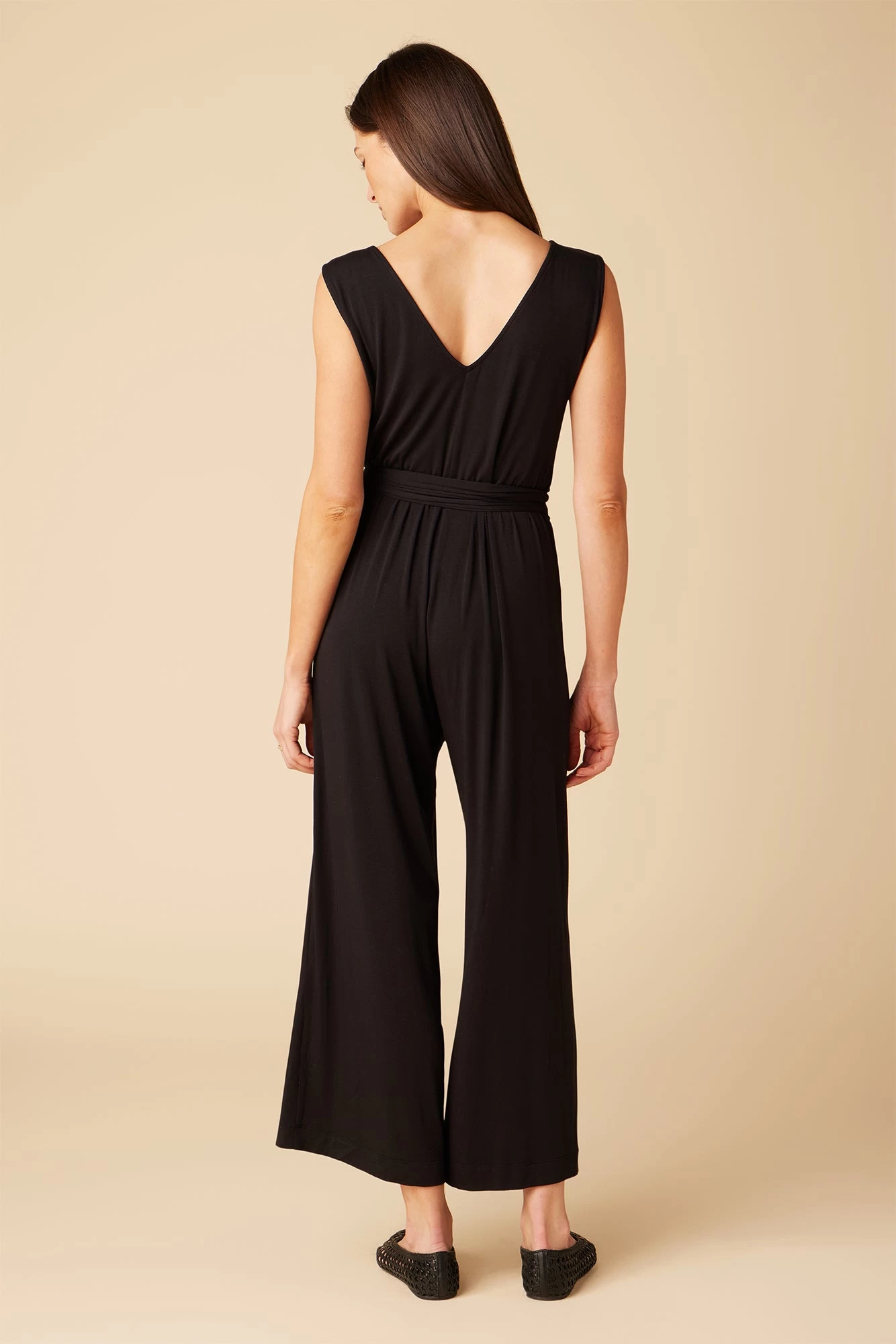 - Sleeveless jumpsuit with an adjustable wrap tie at the waist, open back, and cropped leg.
