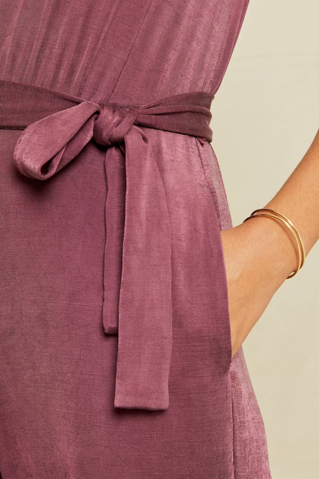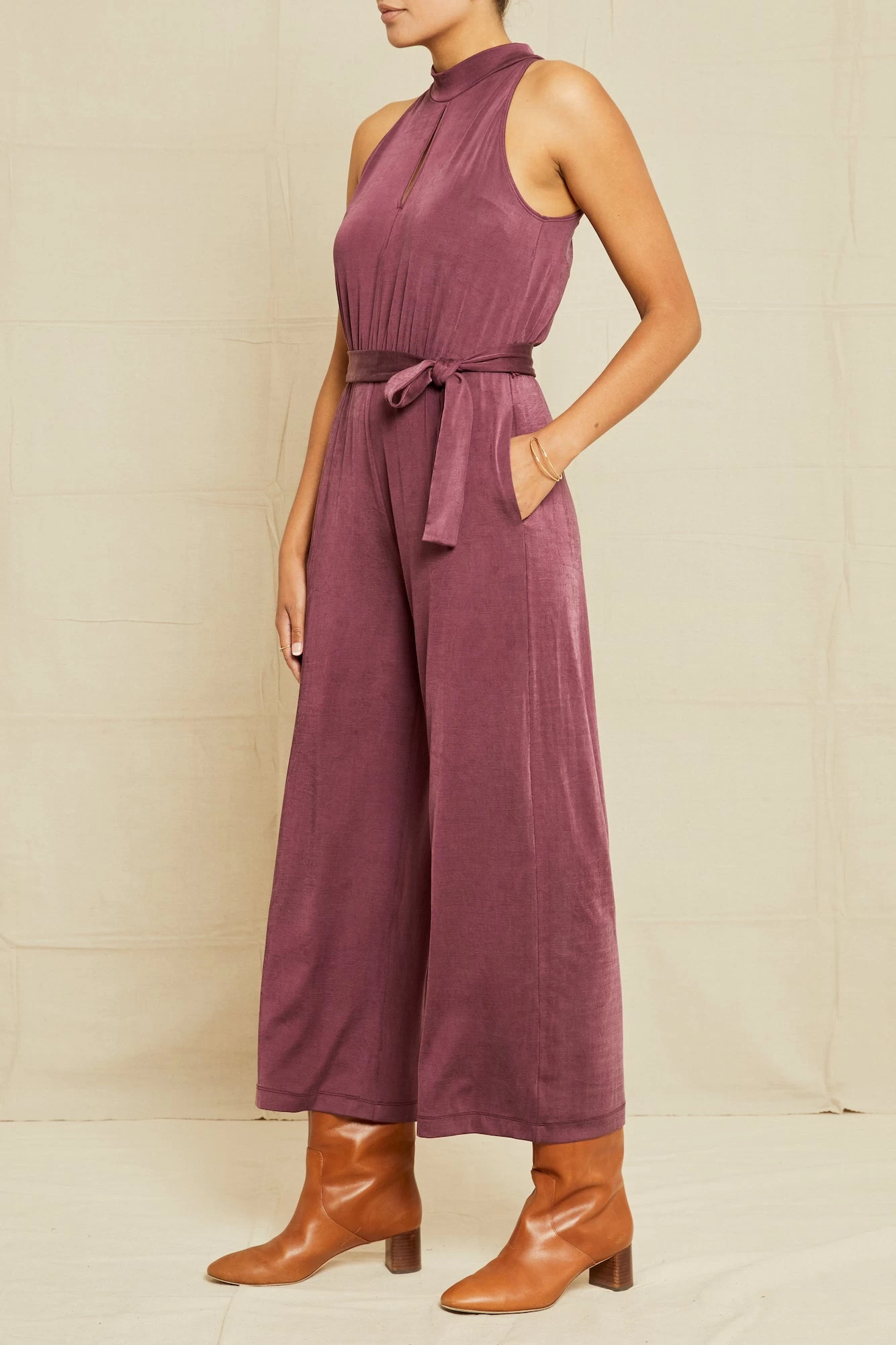 Slim fit, wide length jumpsuit made in our Tencel Luxe fabric, featuring a mock neck halter top, slit at front neck, elastic at waist and belt, and a loop and button at the neck for ease.