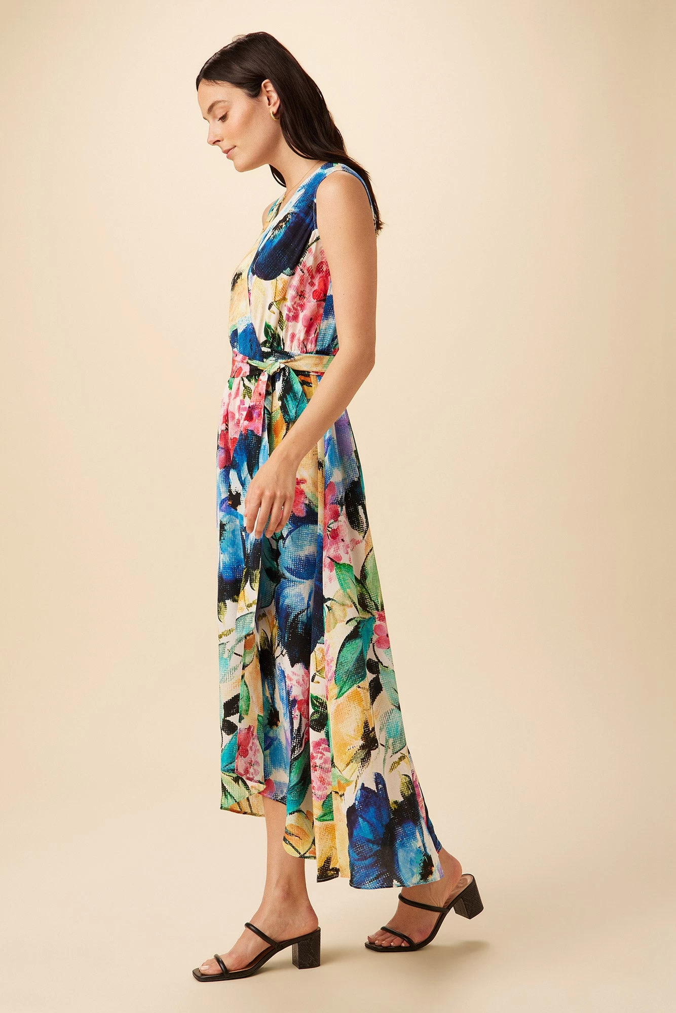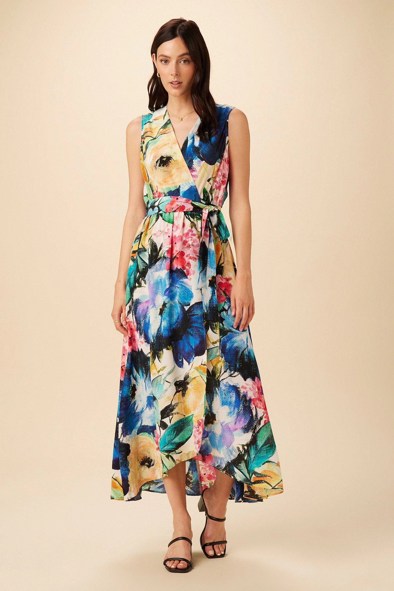 Sleeveless maxi wrap dress with a v-neck, self-tie at the waist, and flowing drape. Made from our luxurious Mulberry silk, the perfect fabric for occasion dressing.