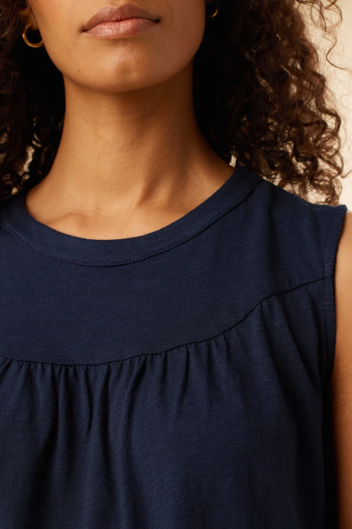 Sleeveless tank with a neckband, gathering in front, and relaxed silhouette. Made in our incredibly soft Reverie Slub fabric, a combination of Organic Cotton and Modal.