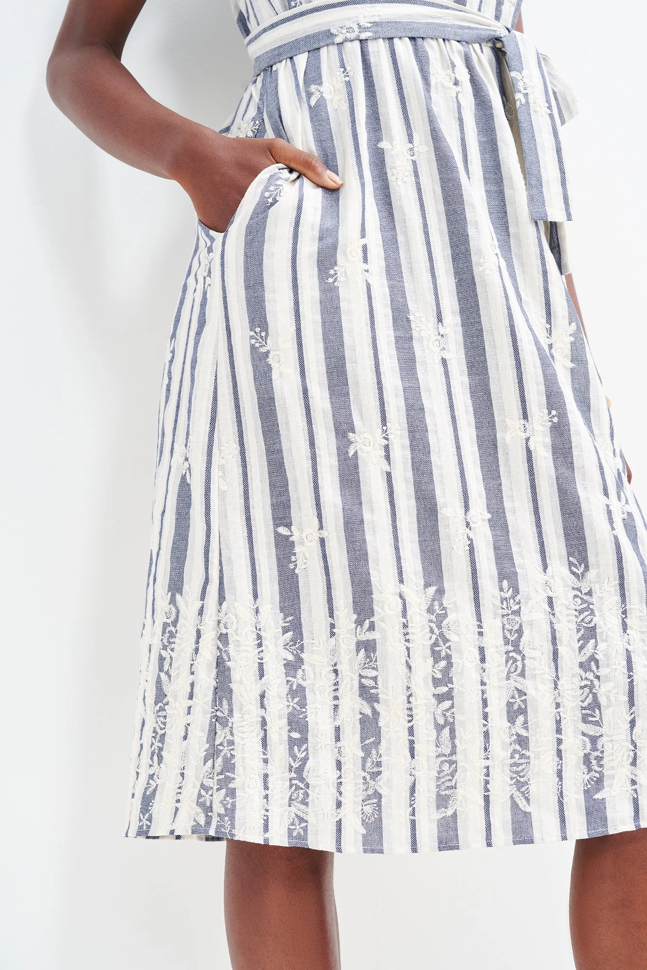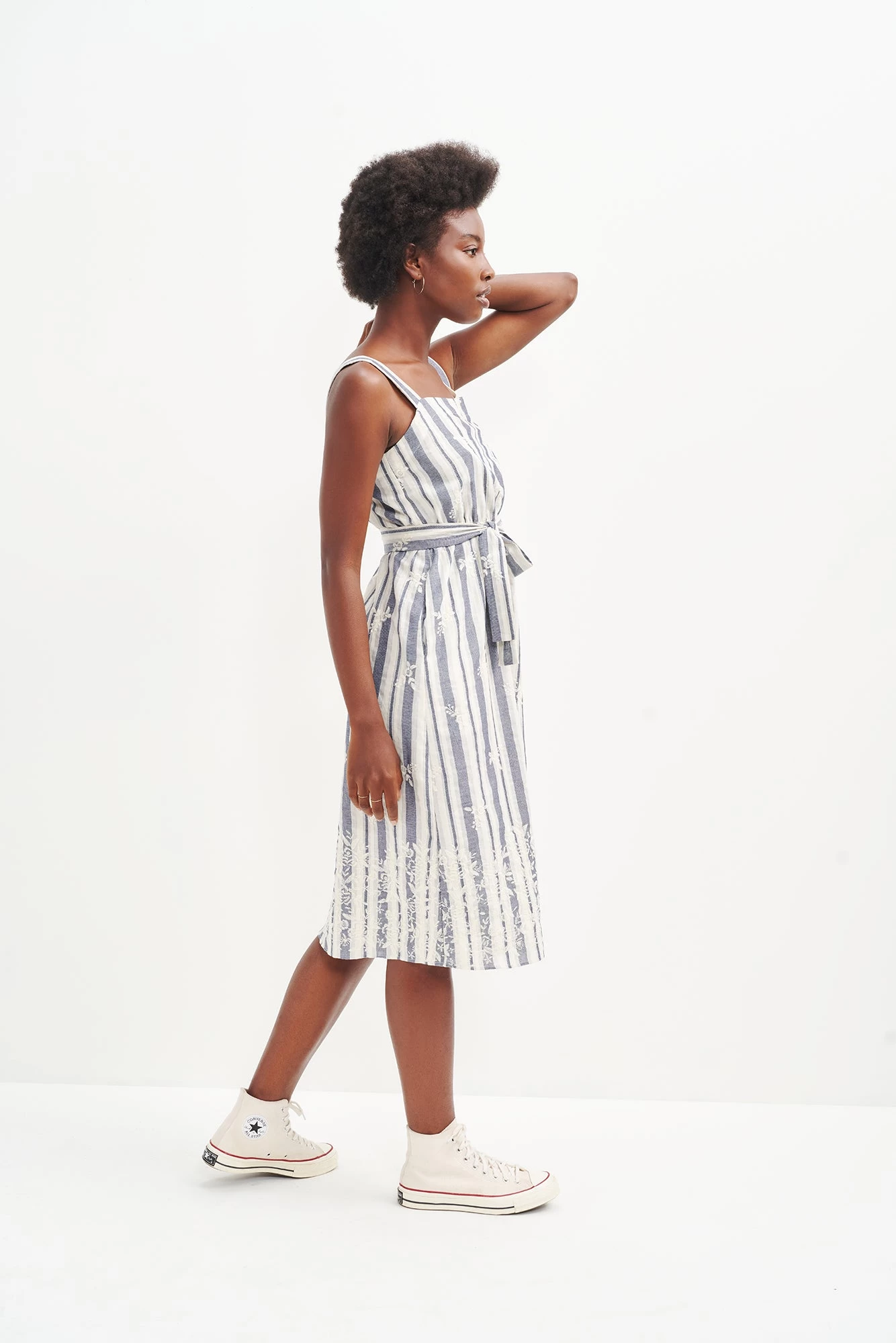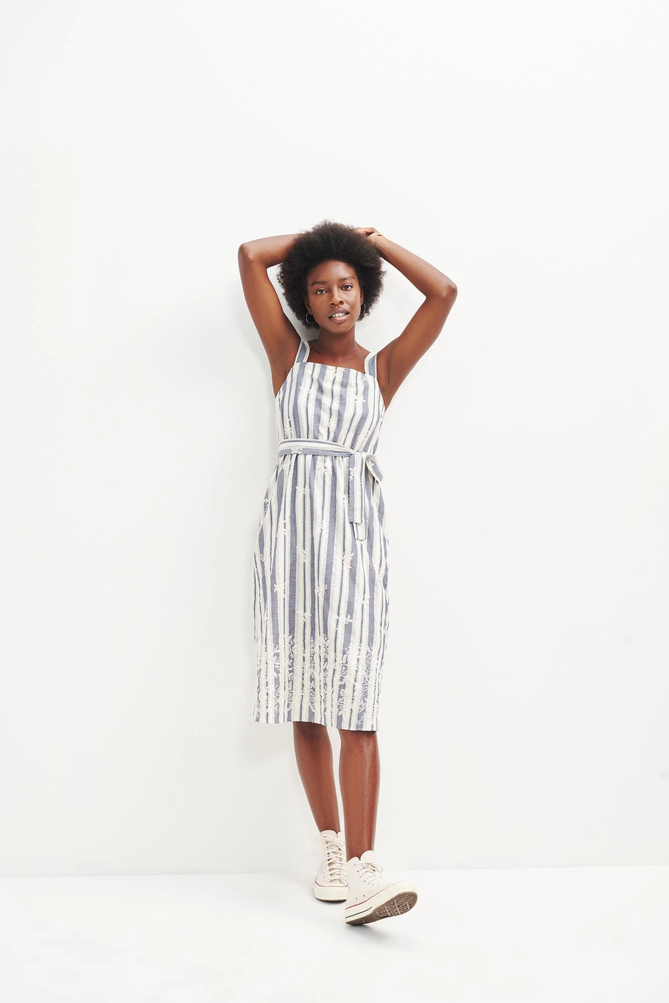 Made from upcycled organic cotton, this sleeveless, square neck dress features lace overlaid on stripes and has the perfect amount of lightweight structure.