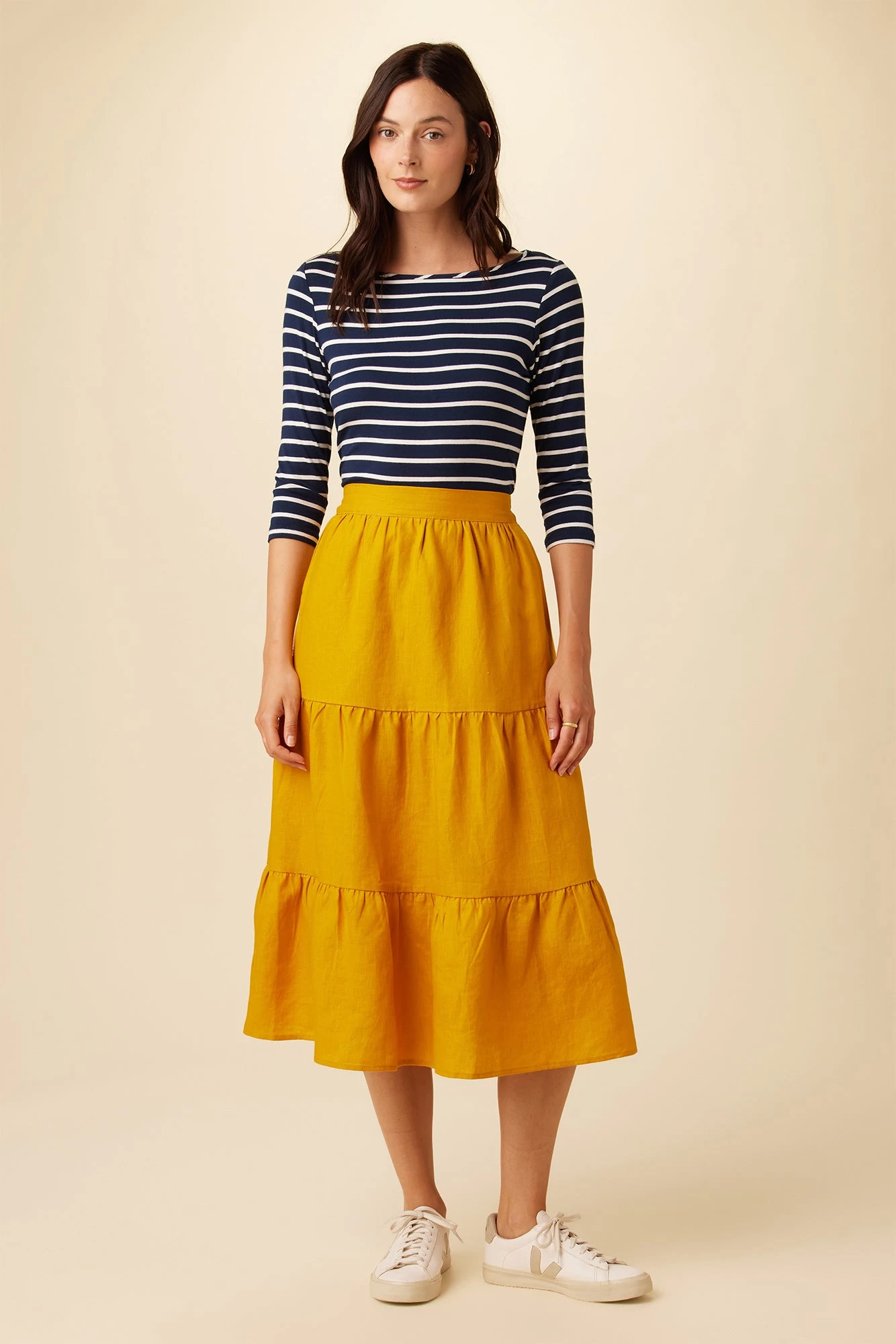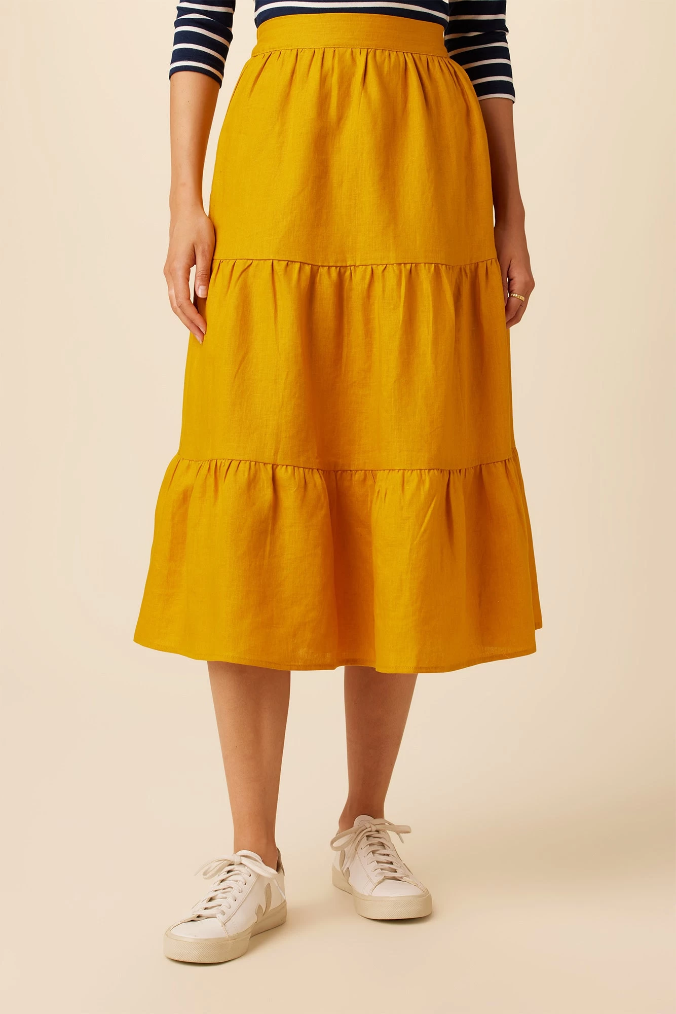Midi skirt with a tiered silhouette and elastic waist, made from 100% linen.