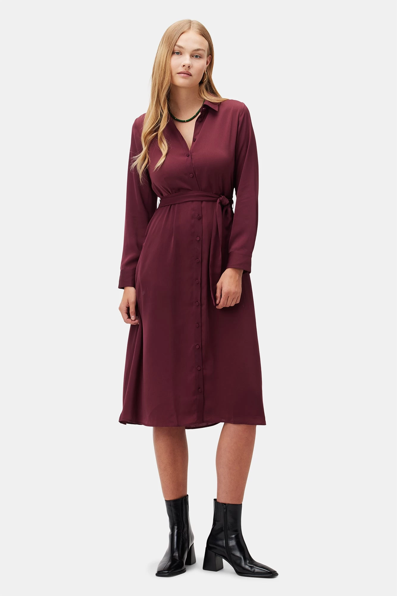 - Long sleeve shirtdress featuring an a-line silhouette, functional buttons and detachable tie at waist.