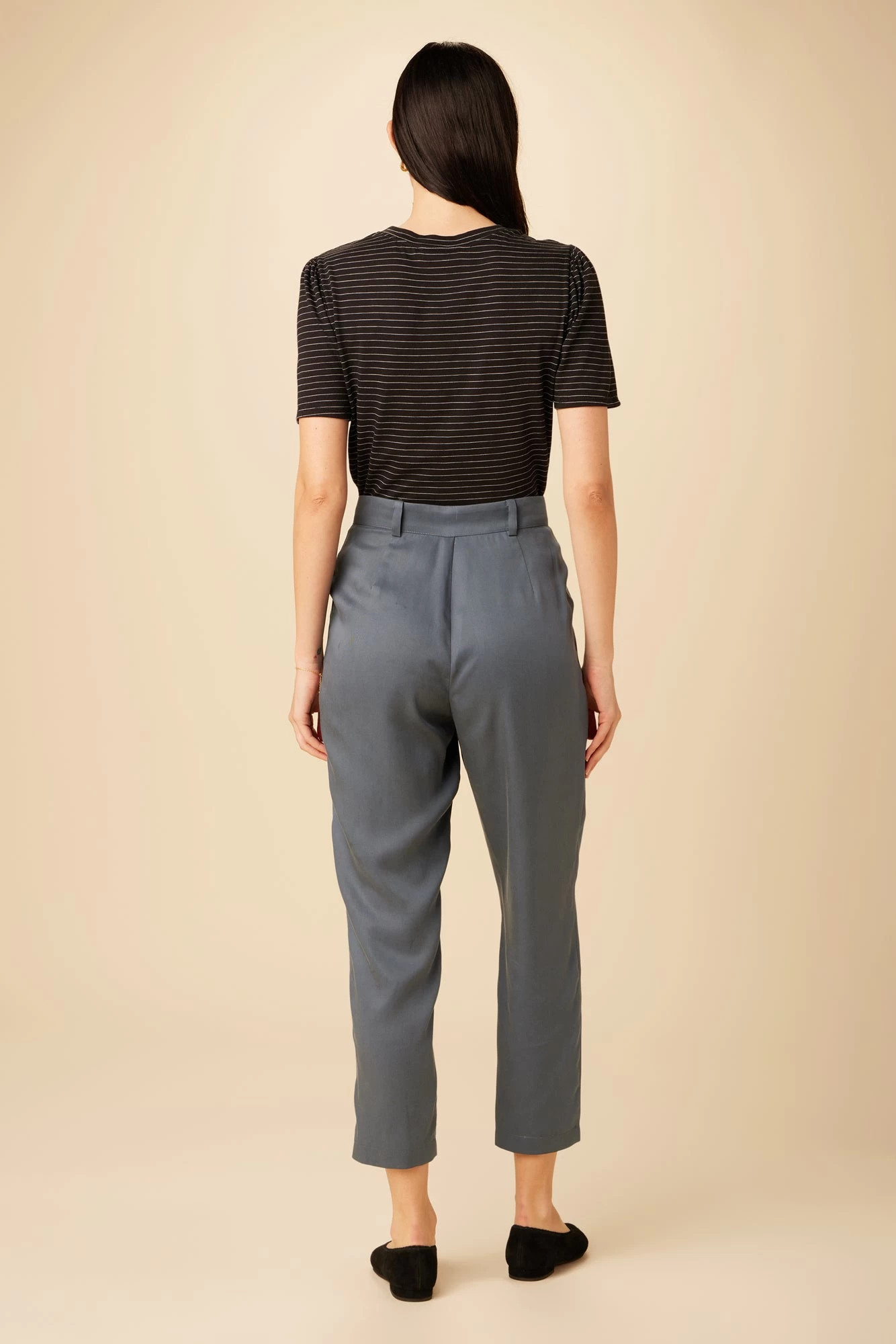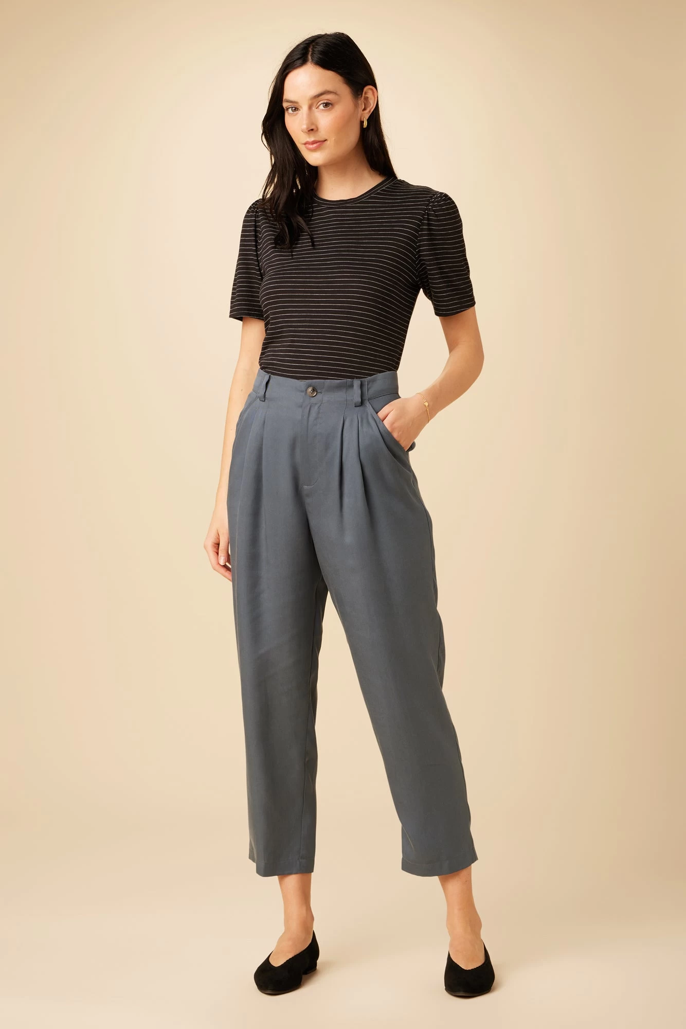 - Tapered pant featuring side pockets and ankle-length for a flattering silhouette.