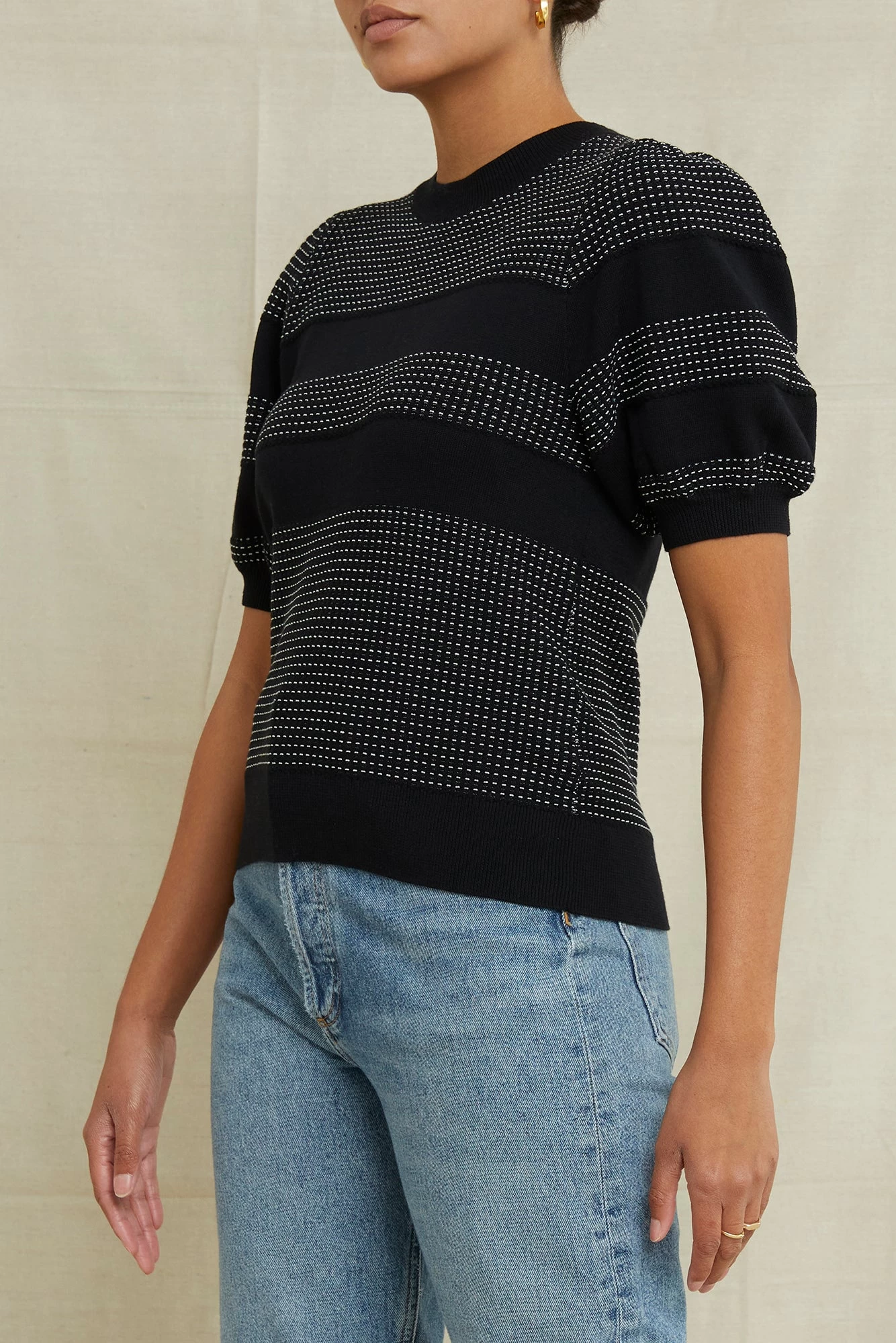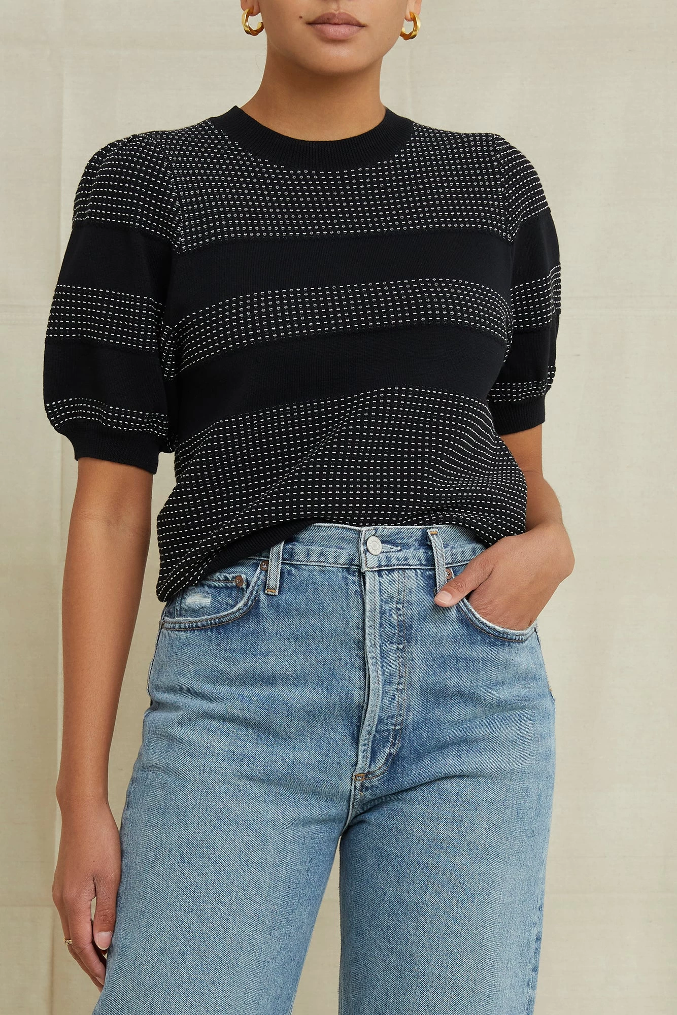 T-shirt sweater with short voluminous puff sleeves and striped stitching. A casual statement piece in neutral shades so you can pair with just about anything.