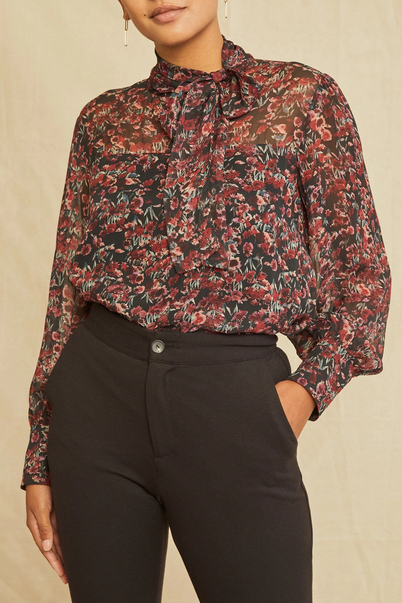 Blouse featuring adjustable neck tie and long sleeves, with buttons at the cuff. Made in our signature Nouveau Silk, a plant-based, washable fabric that feels and looks like silk chiffon.