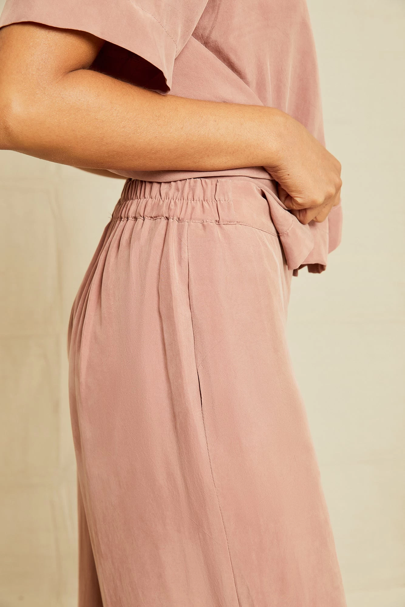 Wide leg pajama pants with side seam pockets and elastic at the back waist. Made from our silky-smooth Cupro charmeuse, a vegan silk alternative made from leftover cotton waste.