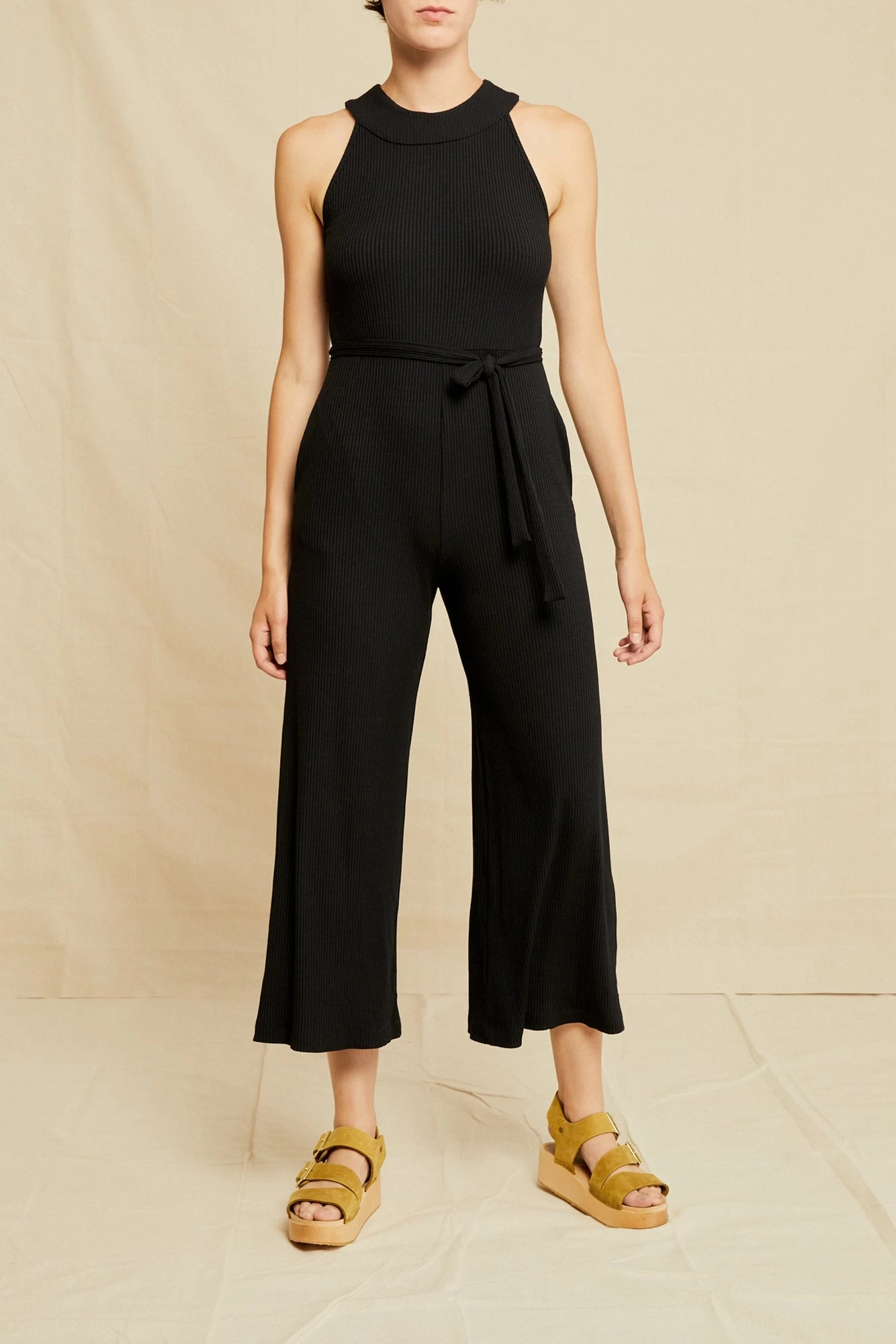 Made in our soft and lightweight Paris Rib fabric, this slim-fit silhouette is wider through the leg and has a 26″ inseam. This silhouette also features a halter-neck with button closure, pockets and an adjustable waist tie for the perfect fit.