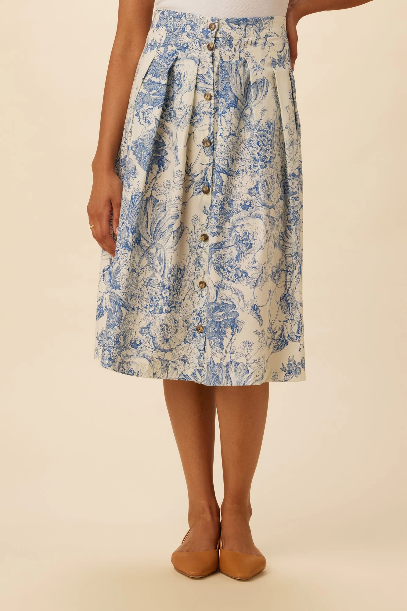 Relaxed fit, below the knee midi skirt featuring pockets, pleast waist detailing, fixed waist and button front placket, made from our Organic Cotton fabric. We suggest pairing this cropped style with our Annika Organic Cotton Blouse for a matching co-ord set.