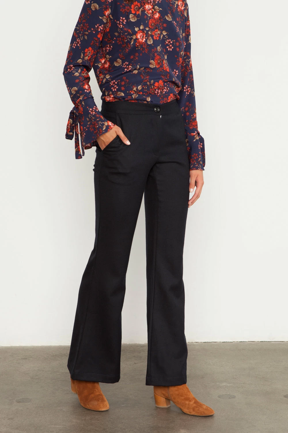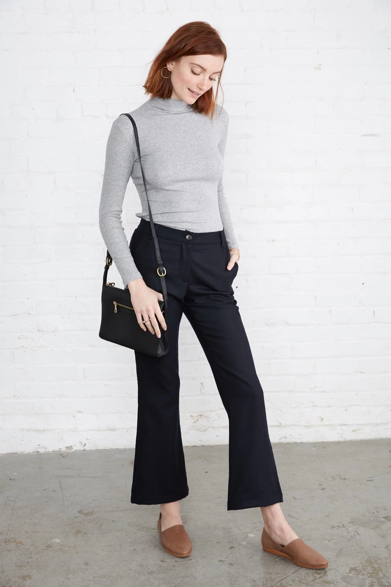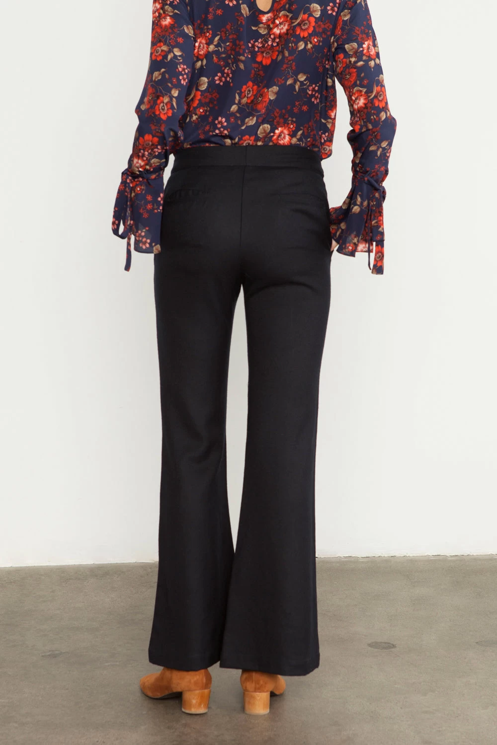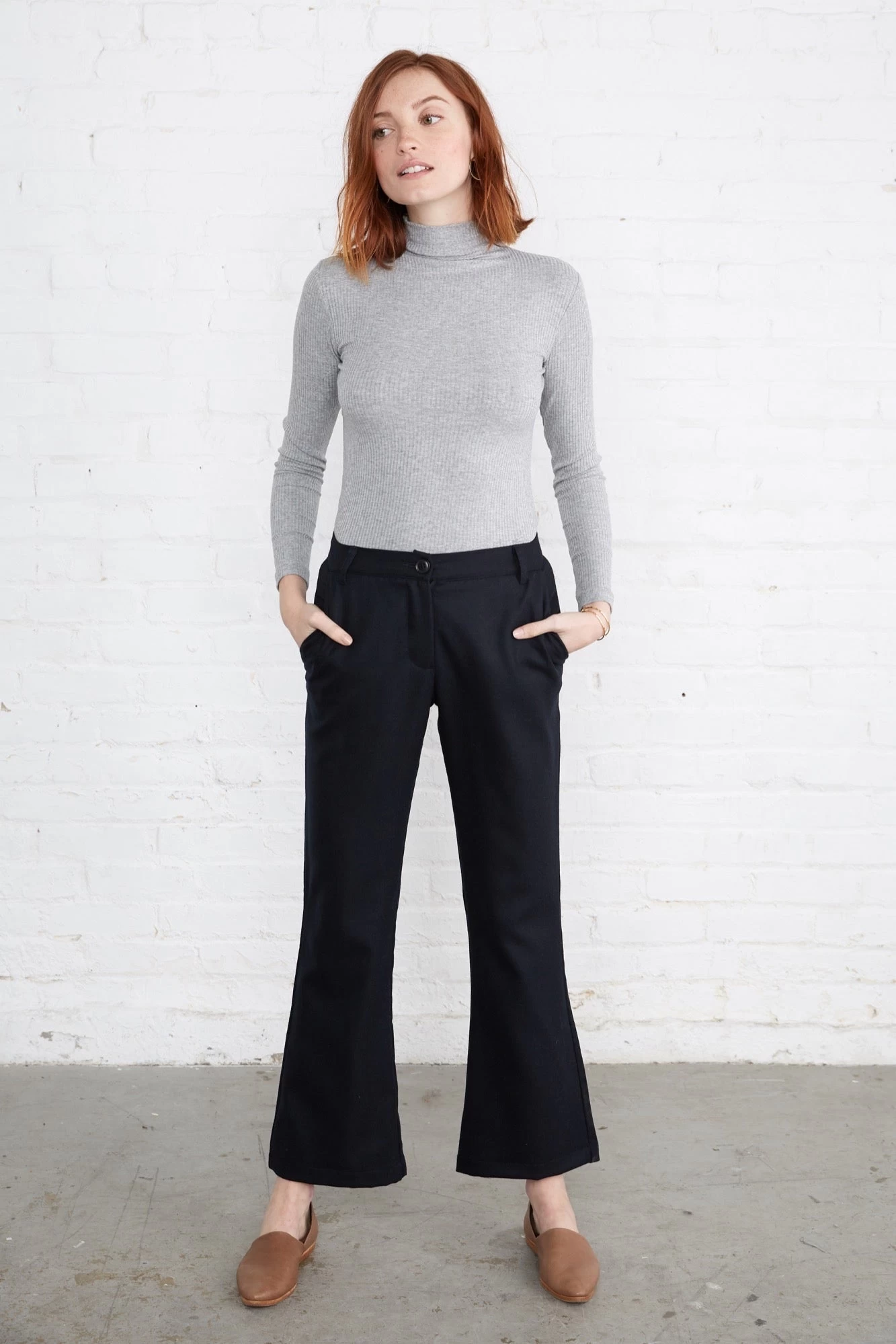 High waisted wide leg cropped flare pant. Made with our signature wool twill. Our wool comes from Tollegno 1900. Renowned for its quality environmental stewardship, Tollegno identifies and incorporates practices that suit the unique environment to promote bio-diversity and grazing.