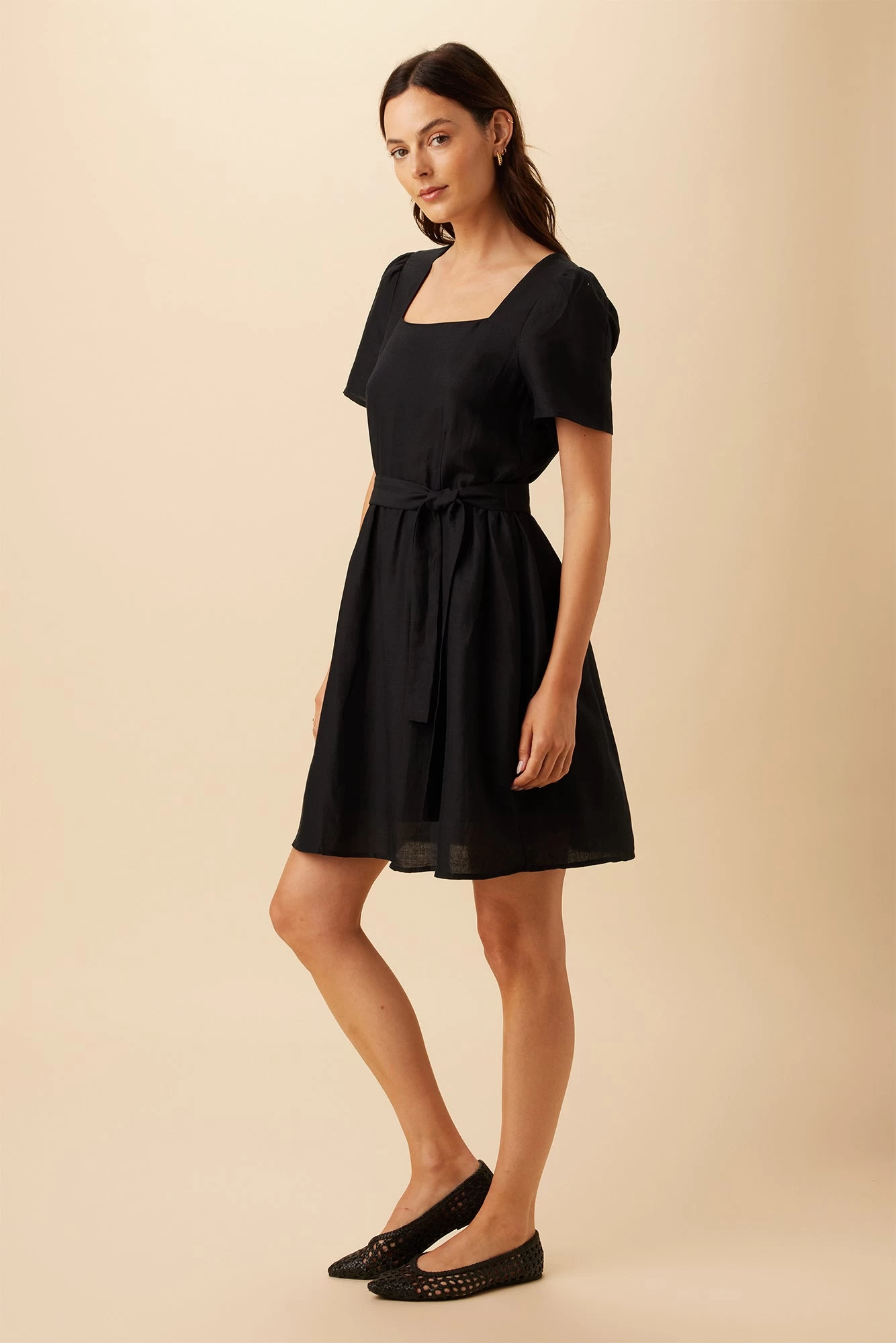 - Short sleeve casual dress with a-line silhouette featuring a square neck line, invisible zipper at back, short puff sleeve, fitted bodice and lined at skirt with cotton.