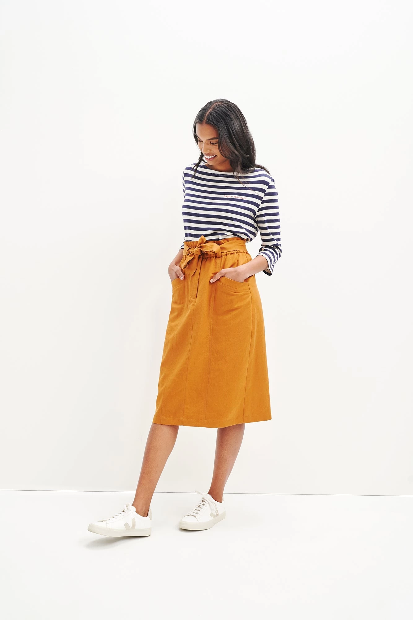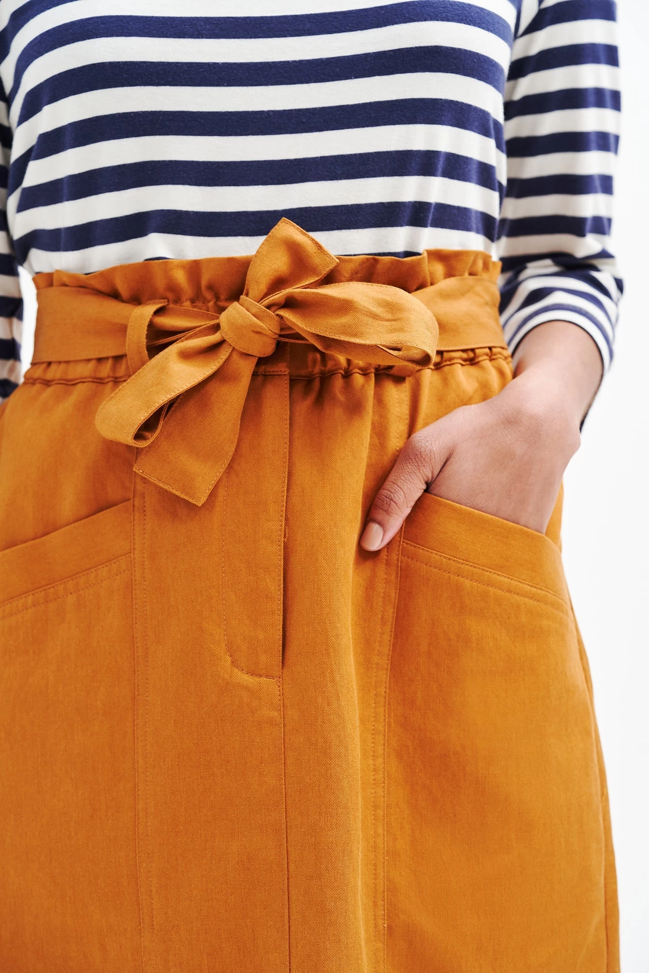 Super high paper bag waist midi skirt with front pockets, an adjustable waist tie, and back slit. Made in our lightweight Femme Fête fabric, a luxe blend of Organic Cotton, Tencel, and Linen.
