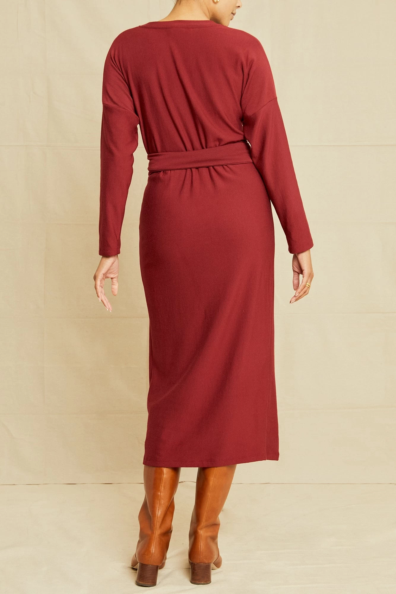 Long sleeve midi dress with an adjustable wrap tie and easy, straight silhouette. Made from our cozy fleece fabrics, this dress is as comfortable as it is flattering.