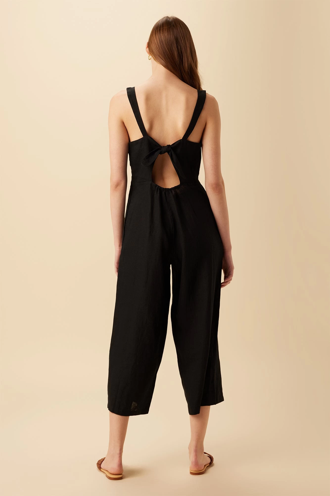 - Linen jumpsuit featuring adjustable back tie, open back, side zip, and cropped length.