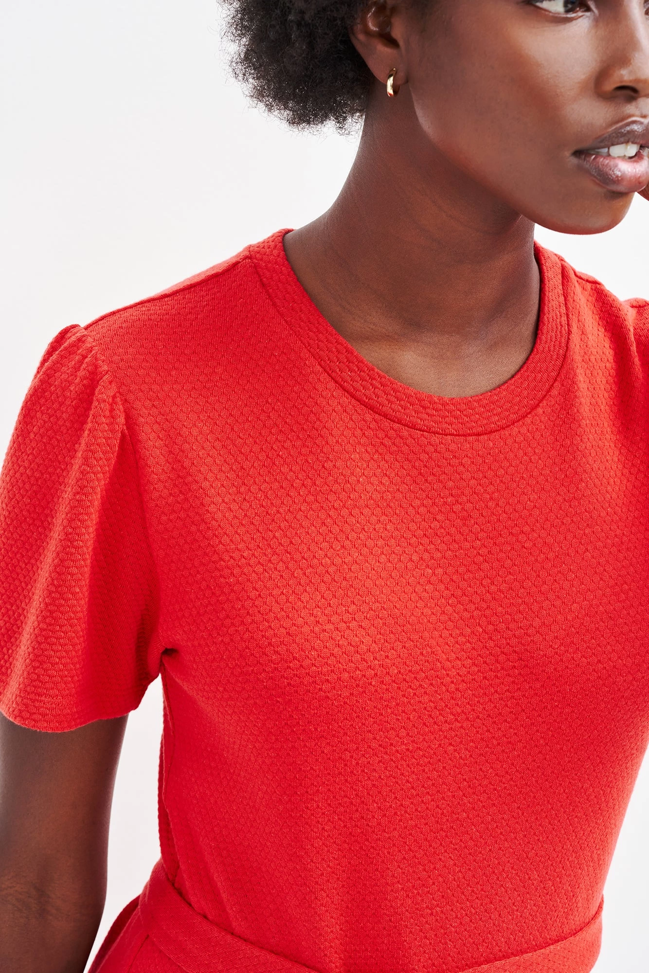 Short sleeve midi dress with a tie waist detail and relaxed, flowing skirt. Made in our soft and lightweight scallop knit, a blend of recycled viscose and organic cotton.