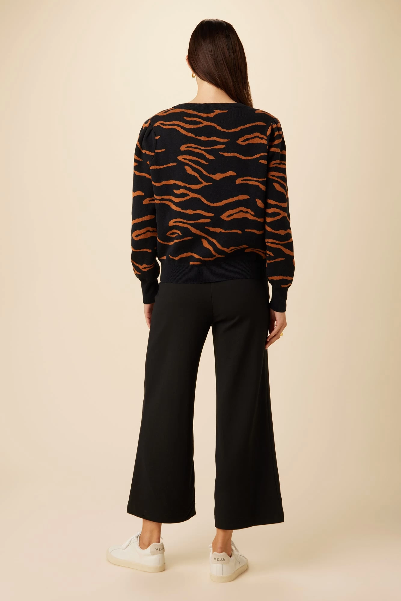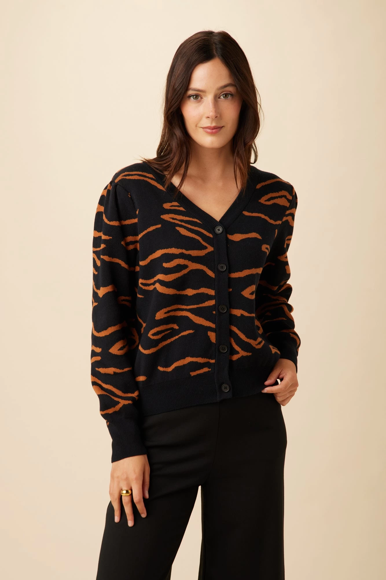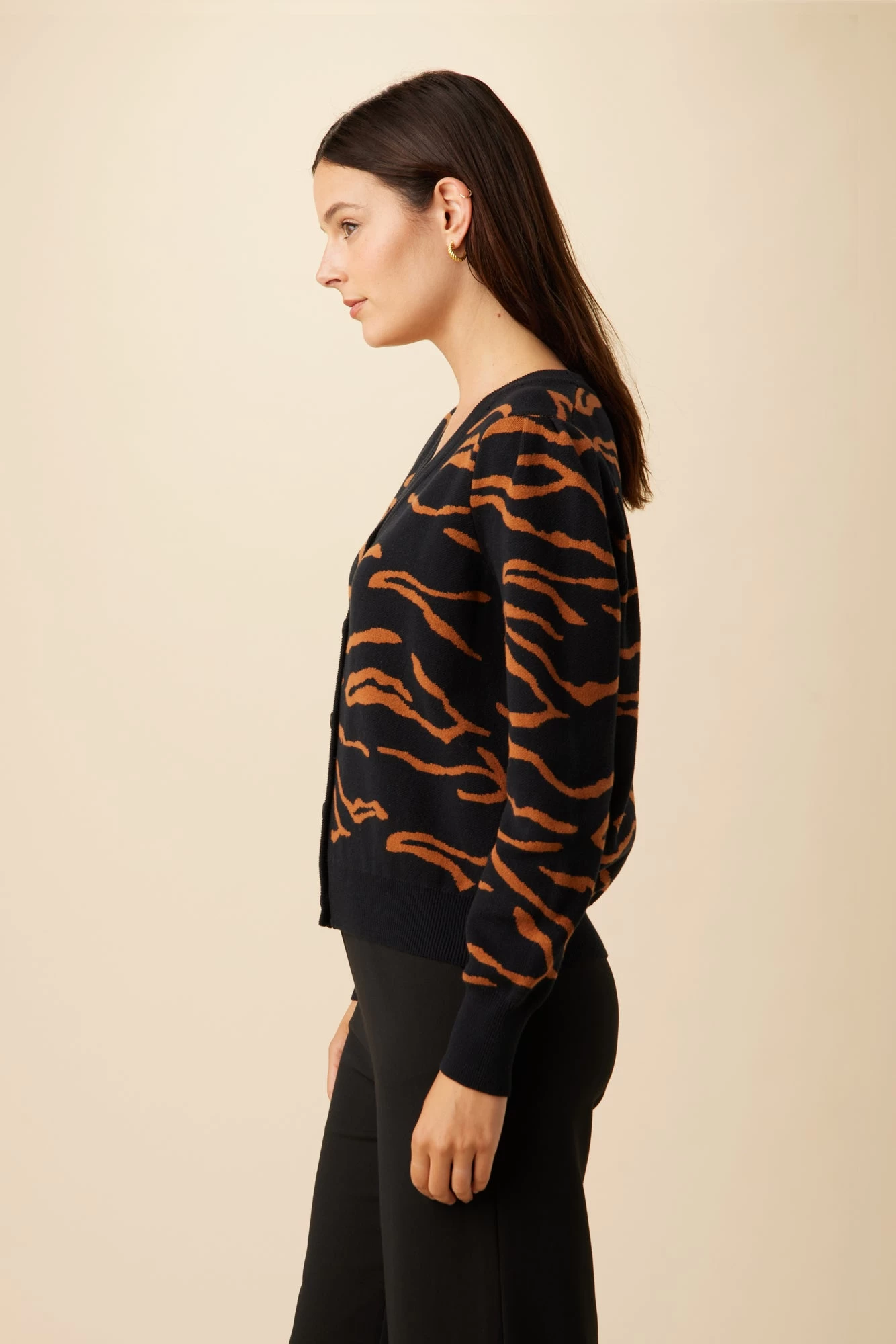 Button front cardigan with slight puff sleeve, made from sustainably sourced organic cotton.